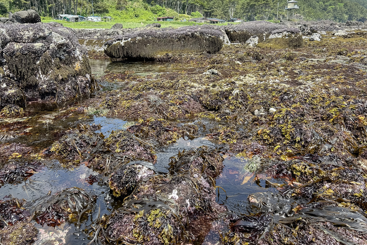恵み豊かな泊海岸はウニが旬を迎えるにつれ、一帯を海藻類がびっしりと覆います。コンブやワカメなど、その種類は実に多様。